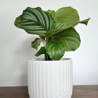 With broad orb-shaped foliage, this Calathea is a must-have for plant collectors who adore foliage plants. Foliage emerges in a cigar shape, unfurling to reveal bold striped leaves that have a shimmery quality.